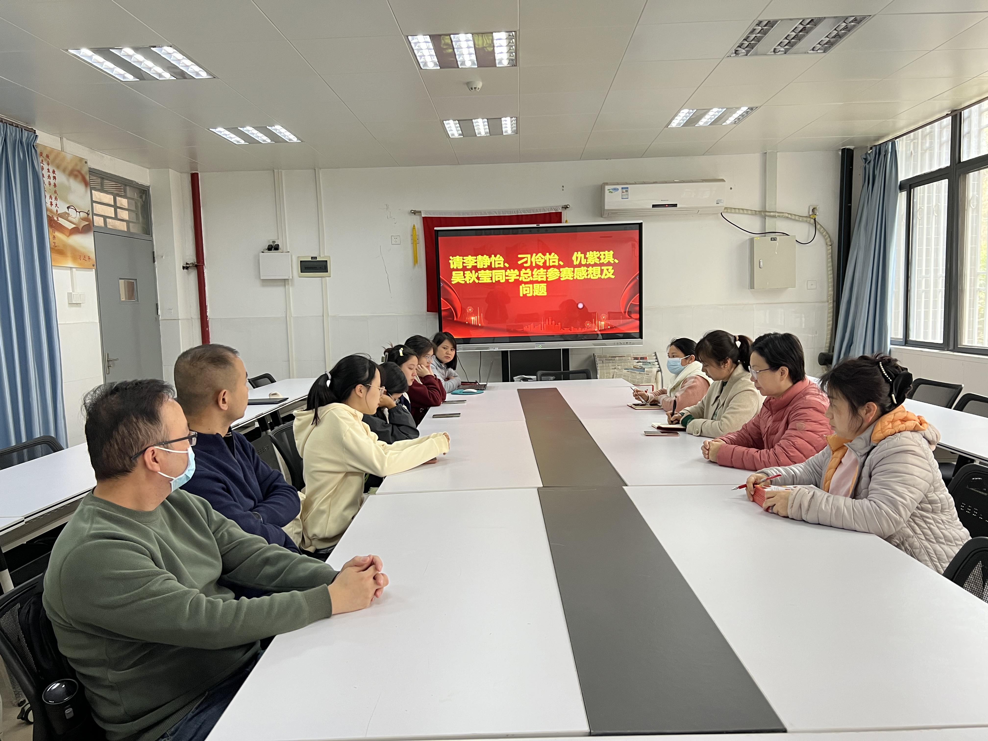 参赛指导老师董慧主持会议,董老师向大会汇报了本次参赛成绩(本次共23支参赛队伍,我校参赛队排第五,获得了二等奖)、点评了学生在备赛、参赛过程中的优势与不足。接着,四位参赛选手分享了备赛、参赛过程中的心得体会,纷纷表示:在不到一个月的备赛时间里,虽然成绩没有达到预期,但收获了团队友谊、吃苦耐劳的精神。