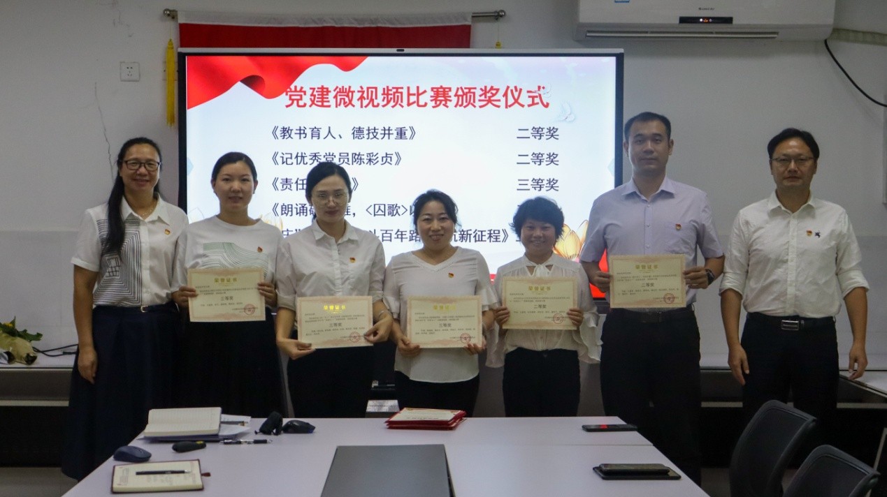 接着,大会进行2022年党建微视频比赛颁奖仪式。2022年学校举行了党建微电影、微视频大赛。药检总支共提交了5份作品,均获奖。其中,检验技术党支部的作品《教书育人、德技并重》荣获二等奖,作者是王富英、陈彩贞、廖奔兵、靖吉芳、欧阳惠君、李玮玮等;《记优秀党员陈彩贞》荣获二等奖,作者是王富英、廖奔兵、欧阳惠君、靖吉芳等;《责任与担当》荣获三等奖,作者是王富英、梁可、廖群艳、蔡丽冰等。药学党支部的作品《朗诵敬英雄,<囚歌>以明智》荣获三等奖,作者是陈善娟;《庆”七一“奋斗百年路