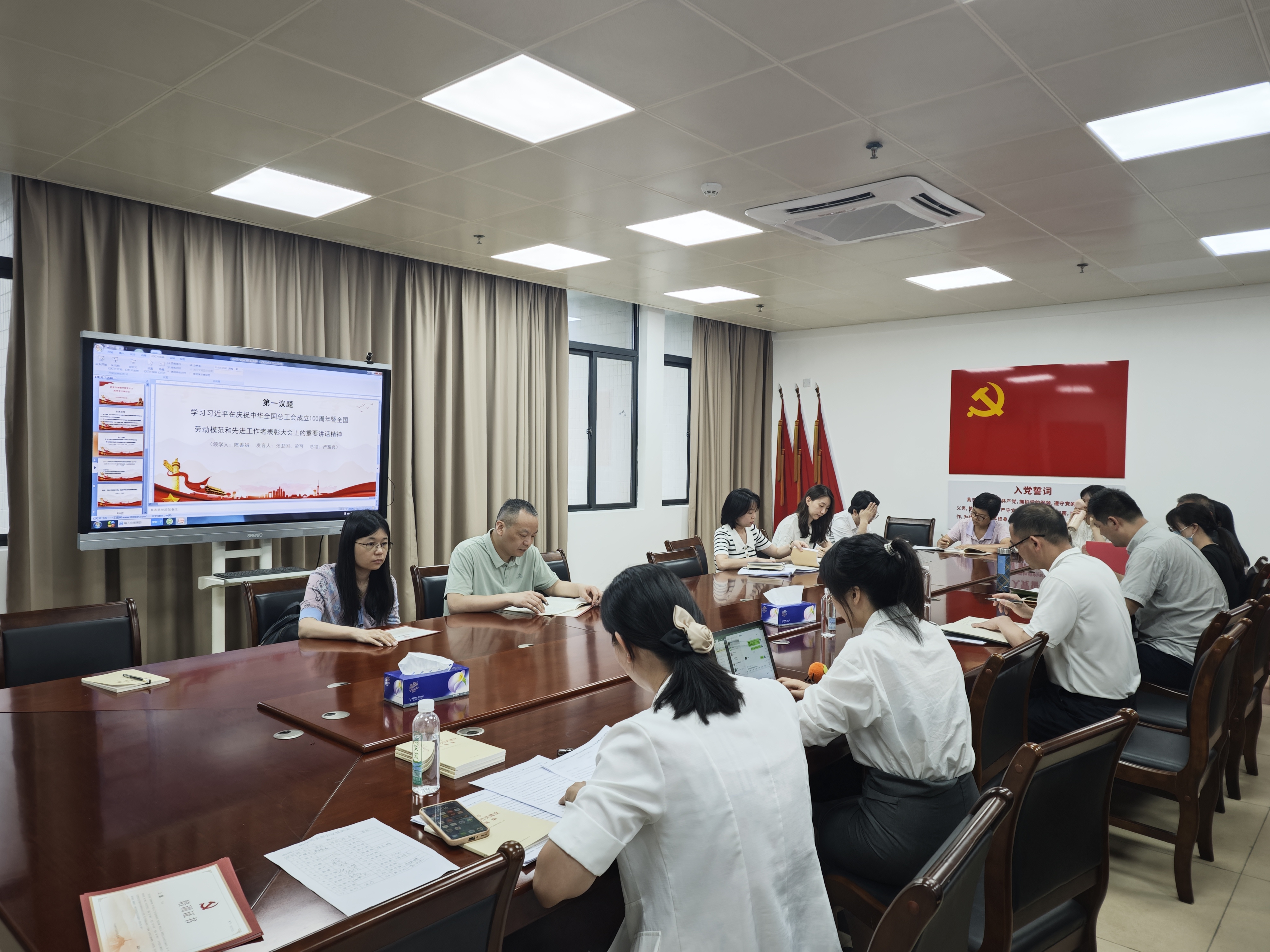 会议首先进行第一议题学习。由支部书记善娟同志领学习近平在庆祝中华全国总工会成立 100 周年暨全国劳动模范和先进工作者表彰大会上的重要讲话精神。卫国、梁可同志作交流发言,耀良同志作总结发言。