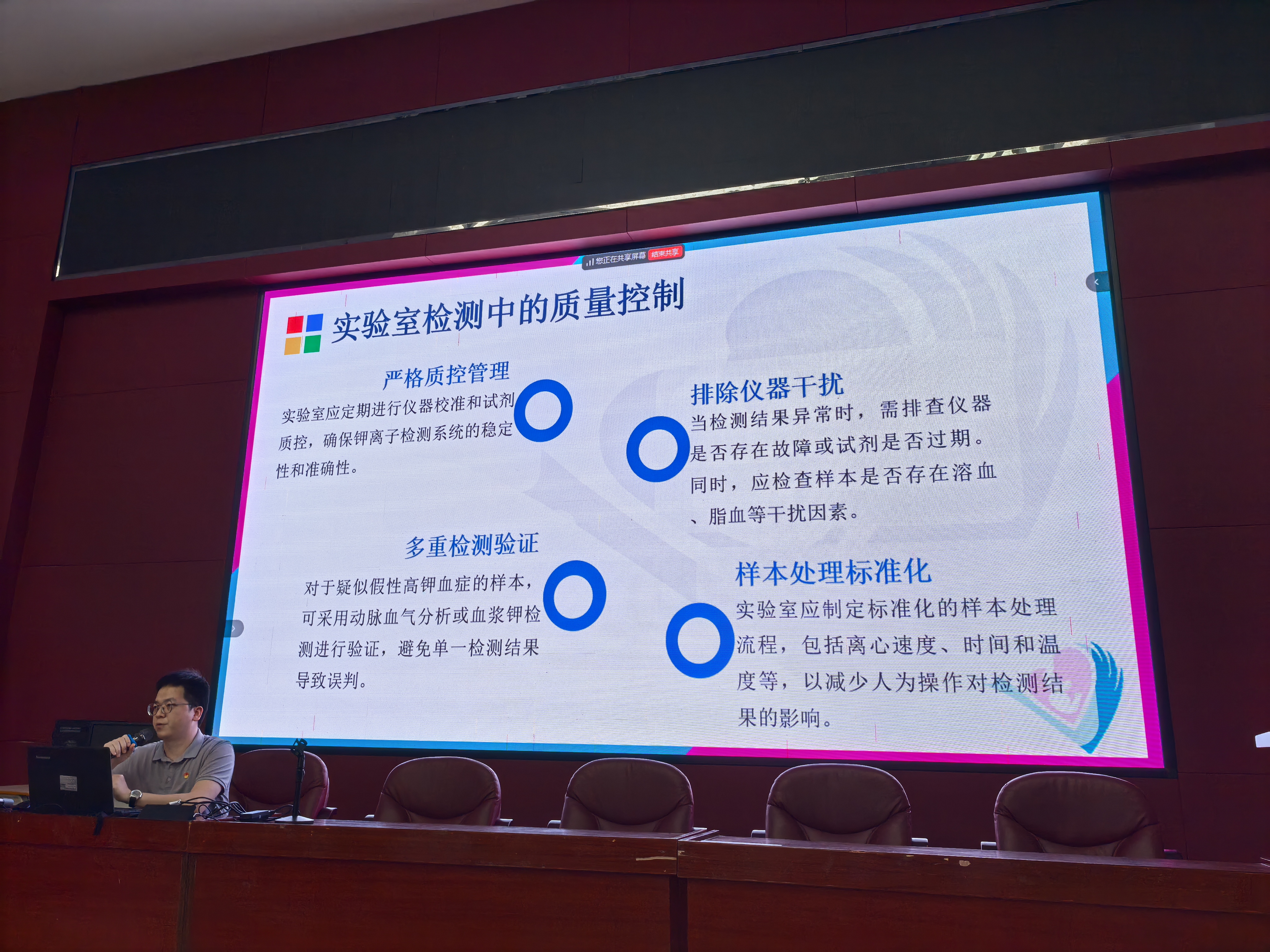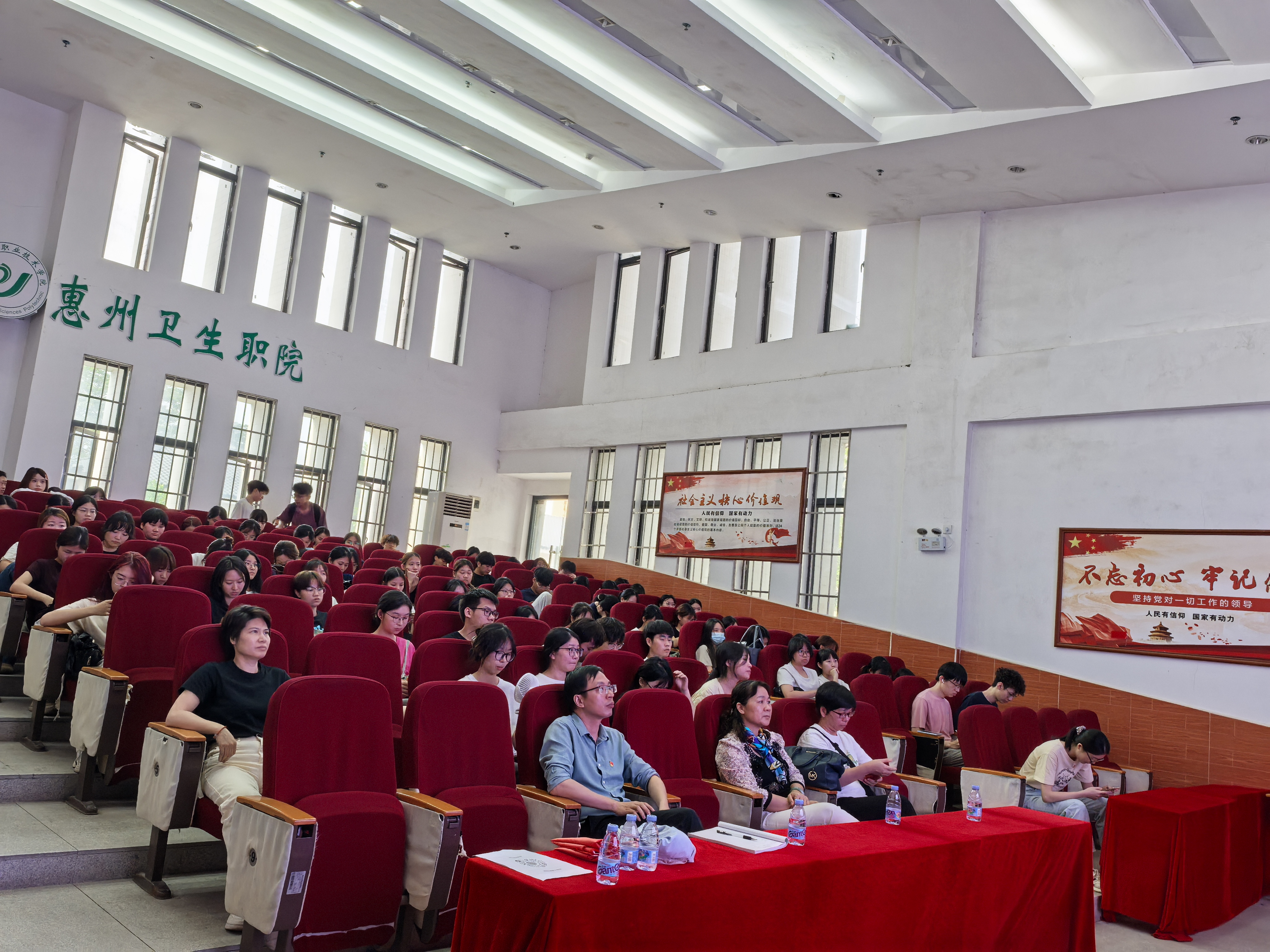 随后,一场精彩纷呈的学术讲座在校园内展开。药学与检验学院学院院长徐英辉主持讲座,惠州市第一妇幼保健院检验科主管技师黄振鹏以“检验之真甄‘钾假’”为题,为同学们带来了一场知识盛宴。讲座采用“现场+腾讯会议”的创新模式,主会场设于行政楼一楼107会议室,各班课室通过腾讯会议同步接入。医学检验技术专业、护理专业、助产专业的一千余名同学,以线上线下相结合的方式,共同聆听了这场意义非凡的讲座。