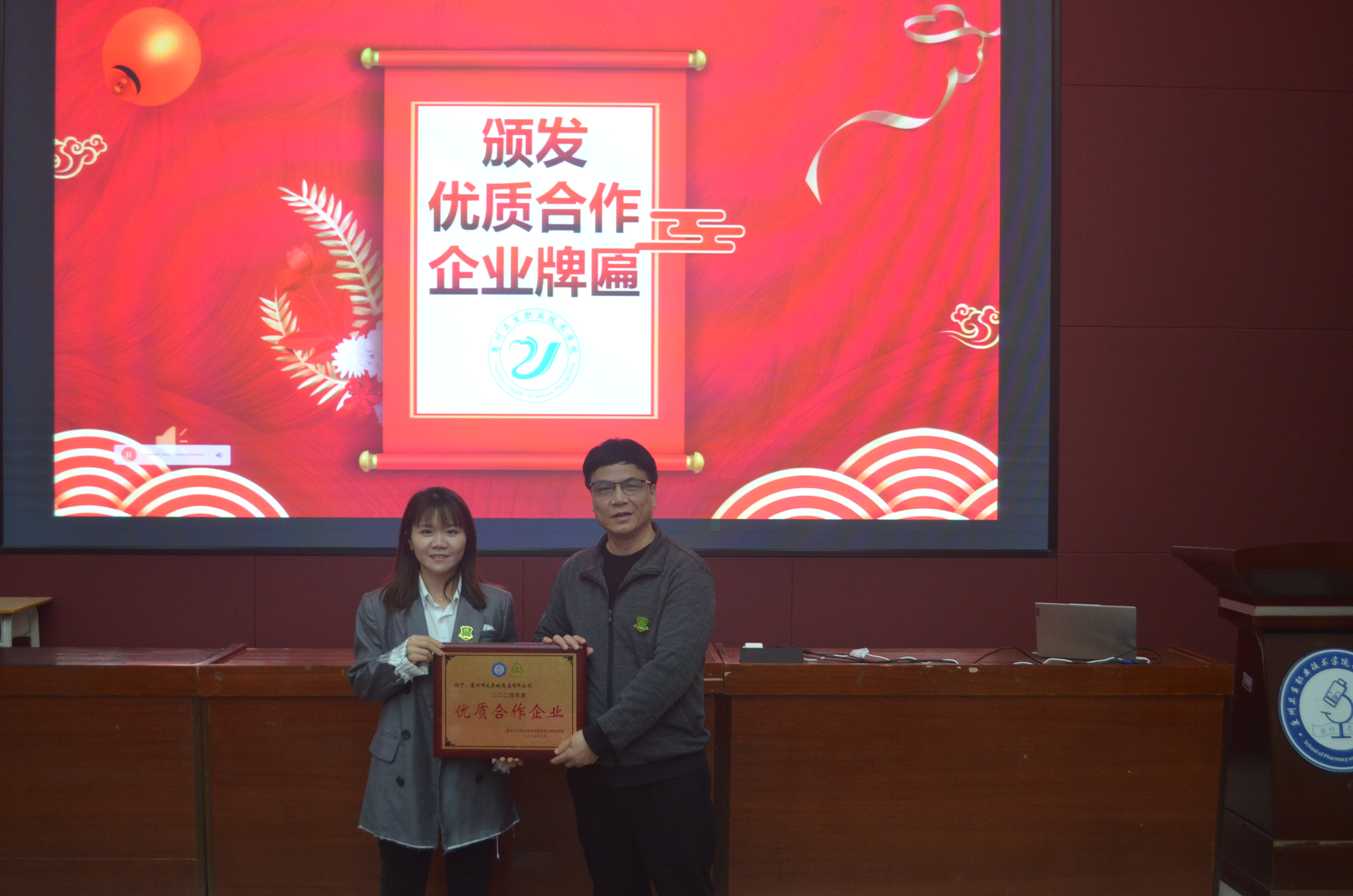校企合作办公室主任江海东代表学校向惠州市大参林药店有限公司颁发“优质合作企业”牌匾,彰显双方十余年合作积淀的深厚基础。