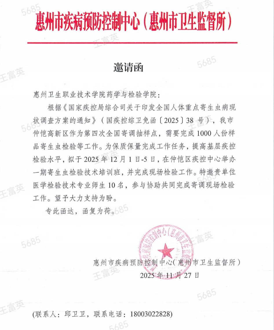12月1日至5日,应惠州市疾病控制中心(惠州市卫生监督所)之邀,我院党总支药学检验党支部书记王富英、学生党支部书记胡立成、药学检验党支部组织委员张新忠,以及医学检验技术专业教师靖吉芳、余群娇等老师带队,率领三十余名医学检验技术专业学生,组成师生志愿者服务队,奔赴仲恺高新区疾控中心开展意义非凡的志愿服务活动。