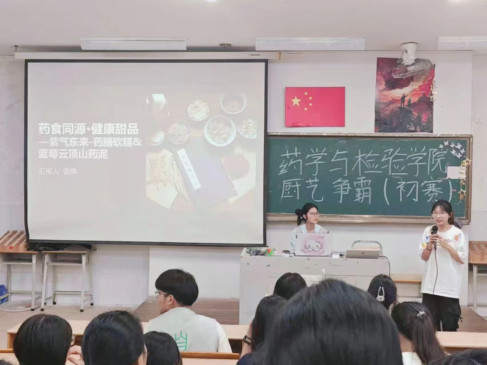 出席本次比赛现场的嘉宾有药学与检验学院自律委员会指导老师曾明慧老师,同时线上参评的老师分别有药学与检验学院副院长胡立成老师、团委书记梁烨美老师、辅导员钟韦锋老师。各评委老师从专业视角与实践经验出发,为选手们的创意与表现打分。选手们以PPT为“灶台” ,创意为“调料”,为师生们带来了一场别开生面的美食视觉盛宴!